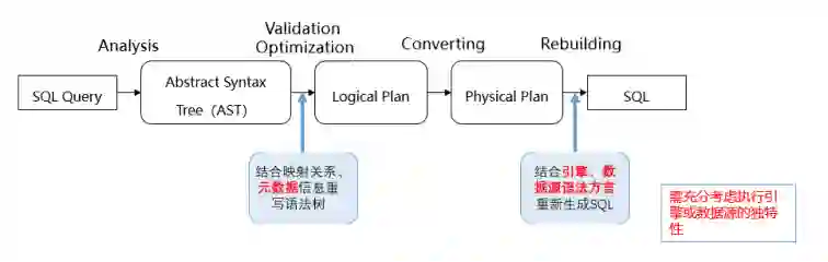2.SQL 转换:SQL 转换发生在两个阶段,一阶段是通过解析器得到抽象语法树后,进行语法树重写以确保该语法树能转换为 SuperSQL 统一逻辑计划;另一阶段是基于 SuperSQL 统一逻辑计划与不同引擎或者数据源语法之间的等价映射关系,能够将 SuperSQL 逻辑计划转换为不同的引擎或数据源语法,做到执行引擎的无感切换,也为下文的智能引擎选择功能奠定基石。