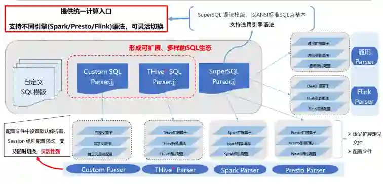 1.SQL 兼容:在进行 SQL 兼容时,为解决部分大数据平台语法与业务强耦合、定制化严重,以及不同语法强行融合易导致歧义的问题,SuperSQL 遵循干净、可扩展、可替换、多场景兼容的兼容准则,提供插件式的解析模块,将 SQL 语法模板化,分类管理,形成可扩展、多样的 SQL 生态。SuperSQL 将 SQL 语法分为两大类即通用型(如 SQL 标准语法,以及常见的 Spark、Hive、Flink 等大数据查询语法)、独特型(自定义语法,不具有普适性),基于分类语法模板、语义扩展定义、配置文件生成多样的 SQL 解析器,并且支持动态切换解析器,灵活性强。任意解析器得到的语法树均将转换为 SuperSQL 统一的逻辑计划,SuperSQL 可基于此逻辑计划生成符合不同引擎或数据源方言语法的执行语句(这一过程即 SQL 转换)。SuperSQL 默认使用通用 Parser,其基于 SQL 标准语法,支持大部分通用大数据语法(如 Spark、Hive 语法),适用于大部分的大数据系统组件。而对于一些与业务逻辑强耦合的自定义语法,支持自定义 SQL 模板,生成自定义解析器,通过这种做法,结合上文提及的生成 SuperSQL 统一执行计划以及下文提及的 SQL 转换,可以灵活地将业务任务切换到指定引擎。