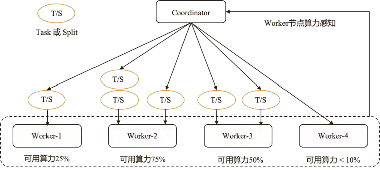 天穹 Presto Coordinator 在运行过程中,会实时感知 Worker 节点的算力变化情况,同时计算出对应的节点可用算力权重,在 Task 和 Split 的调度过程中,针对不同的算力权重,根据模型计算出相应的 Worker 上还可分配的 Task 或 Split 数目,对于算力严重下降的节点,少分配或不分配 Task 或 Split,尽量避免长尾问题,从而做到自适应的调度。