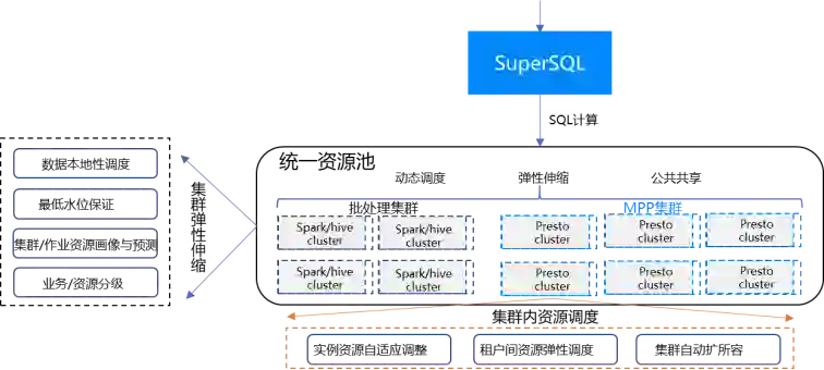通过 SQL 兼容和 SQL 转换,SuperSQL 能够统一计算入口,整合大数据平台组件,降低大数据系统使用的门槛和繁琐程度。