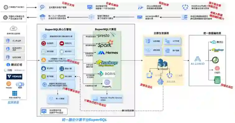 SuperSQL 是腾讯自研的下一代大数据自适应智能计算平台。通过开放融合的架构,实现一套代码高效解决公有云、私有云、内网的任何大数据计算场景问题。我们通过将异构计算引擎 / 异构存储服务、计算的智能化 / 自动化、SQL 流批一体纳入内部自适应闭环,给用户提供极简统一的大数据计算体验。用户能够从繁杂的底层技术细节中解脱出来,专注于业务逻辑的实现,像使用“数据库”一样使用“大数据”,实现业务逻辑与底层大数据技术的解耦。