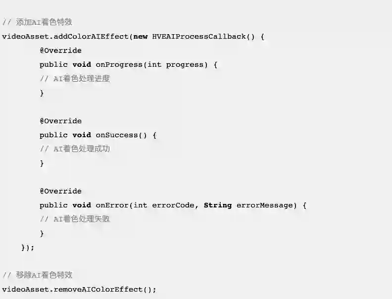 在快速集成SDK之后,只需要增加几行代码就可以调用AI着色能力,轻松实现图片和视频处理的AI智能化: