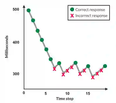 图3:自适应阶梯法向评估者显示不同时间曝光的图像。正确时减少,错误时增加。模态暴露测量他们的感知阈值。