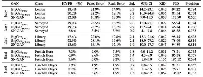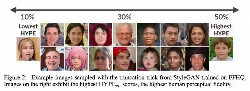 我们引入两个基准:使用时间感知阈值的HYPEtime和报告无时间限制的错误率的HYPE∞。我们展示了我们的方法在六种模型中的图像生成效果:StyleGAN、Sn-GAN、BigGAN、ProGAN、Begin、WGAN-gp、四种图像数据集Celeba-64、FFHQ-1024、CIFAR-10、ImageNet-5,以及两种采样方法。{有、无截断技巧}。