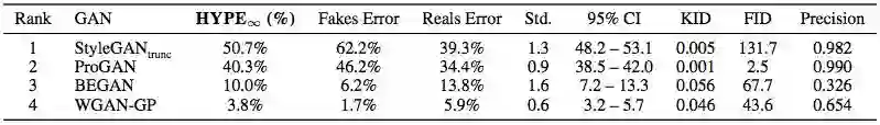 表2:在CelebA-64上训练的四个GANs上的HYPE∞。与直觉相反,真实误差随着假图像上的误差而增加,因为评价者变得更加困惑,两种分布之间的区分因素变得更加难以辨别。