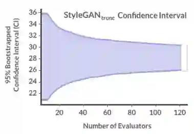 为了处理这种权衡,我们在StyleGANtrunc上运行了一个HYPE∞实验。我们用60个评估者完成了一个额外的评估,并计算了95%的自举置信区间,从10到120个评估者中进行选择(图4)。我们看到CI开始聚集大约30名评估人员,这是我们推荐的要招聘的评估人员数量。