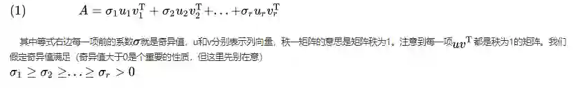 奇异值往往对应着矩阵中隐含的重要信息,且重要性和奇异值大小正相关。每个矩阵A都可以表示为一系列秩为1的“小矩阵”之和,而奇异值则衡量了这些“小矩阵”对于A的权重。