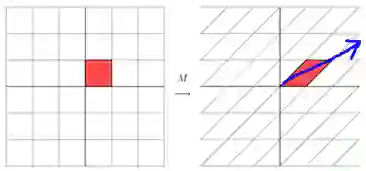 很遗憾,此时我们再也找不到一组网格,使得矩阵作用在该网格上之后只有拉伸变换(找不到背后的数学原因是对一般非对称矩阵无法保证在实数域上可对角化,不明白也不要在意)。