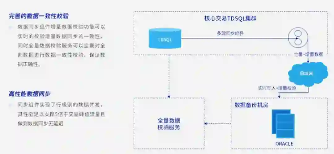 在张家港行数据库迁移实践中,核心交易集群是 TDSQL,TDSQL 多源同步方案通过内部的局域网,将存量和增量数据,写入到备份机房,同时也通过全量的数据校验服务保证数据源、目标是完全一致来进行风险控制。当核心交易系统如果出现一些小概率不可恢复的灾难时候,系统可以在短时间内将交易的服务全部切换到备份机房的 Oracle 上,作为银行传统核心系统数据库迁移的安全兜底方案,最后确保数据库顺利迁移。