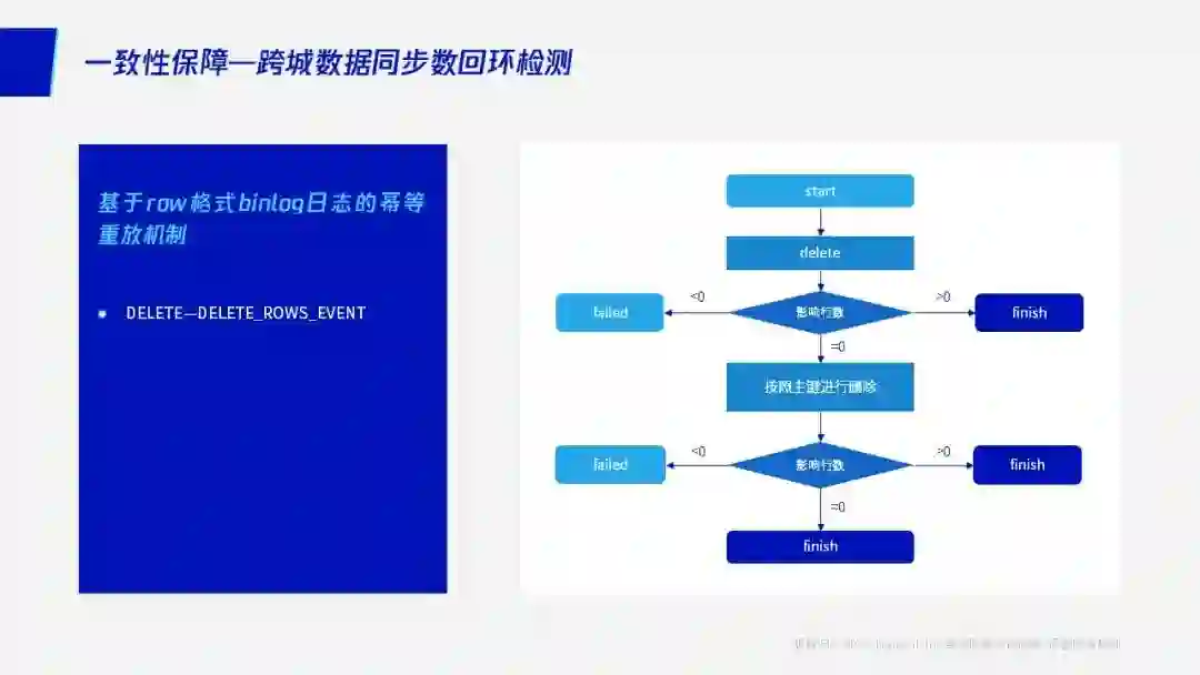 这个过程中,delete 结束后大于 0 就成功;小于 0 就是失败;等于 0 的时候我们认为它可能没有匹配到行,这个时候我就按照主键操作——因为删除的操作最终的结果就是目标一定没有了当前删除的消息主键所标识的这一行——这条操作完成后,DB 里一定没有这行数据,因此仅仅是按照主键进行删除就可以了。这个时候如果影响行数大于 0,则删除成功。如果等于 0,就认为按照主键去匹配,本身删除不到,匹配不到——意思是本身目标就没有这条要删的主键所标识的数据——所以实际上它的结果跟要做完删除的结果,影响是一样,也就结束这一条删除的幂等。