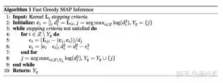 行列式点过程的MAP求解是一个复杂的过程,Hulu的论文中提出了一种改进的贪心算法能够快速求解,该算法的时间复杂度为 ,