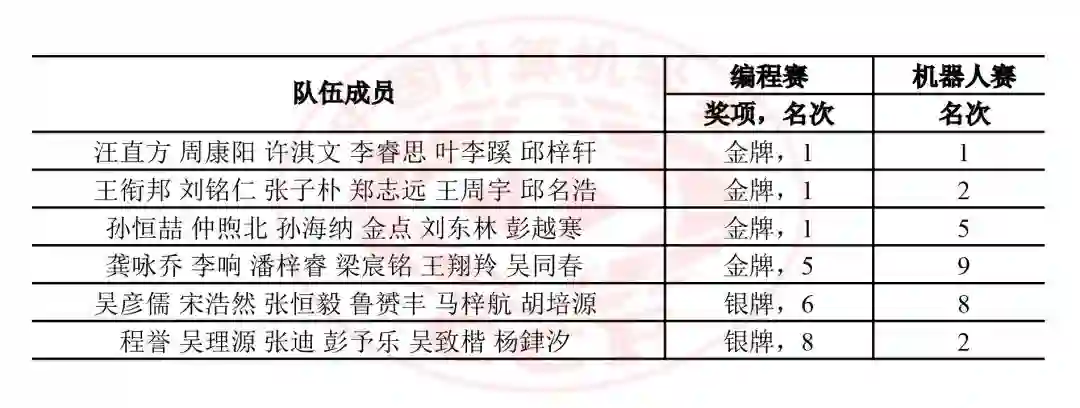 中国队共有15名选手报名线上A组,21名选手报名线上B组。选手们经过努力拼搏,在4场比赛中均发挥出色:在数学赛中获20金15银1铜;在码力赛中获32金4银;在马拉松赛中获24金12银;在团体赛中获4金2银,总成绩位居所有参赛队伍之首!