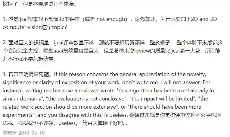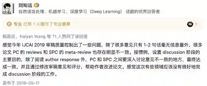 清华大学副教授、博士生导师刘知远老师也参与了知乎上的讨论,认为“感觉今年IJCAI 2019审稿质量控制出了一些问题……有些领域应该没有很好地完成discussion阶段的工作。”