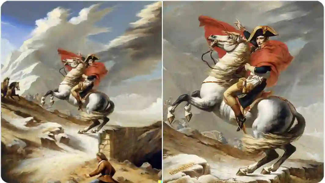 为了进行直观比较,还有人进行了前后对比。我们以「骑马的人」为例。左边是 Outpainting 生成的,右边是没有 Outpainting 生成的原始图像。相比右边来说,左边画面内容更加丰富,表现出的场景更多: