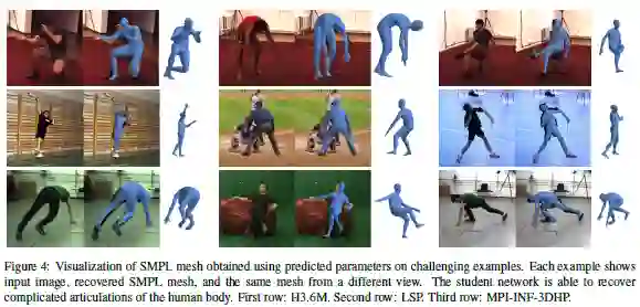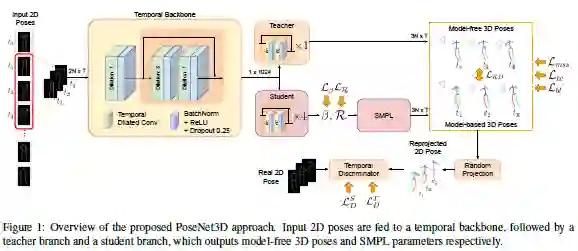从二维关节中恢复三维人体姿态是一个高度无约束的问题。本文作者提出了一种新的神经网络框架PoseNet3D,其以2D关节点作为输入,输出3D骨架和SMPL人体模型的参数。作者使用了学生-老师框架,从而避免了在训练过程中使用3D数据如配对/未配对的3D数据、动捕数据、深度图或者多视角图像等等。作者首先使用2D人体关键点训练了一个教师网络输出3D人体骨架,教师网络将其知识提取到学生网络中,然后学生网络预测基于SMPL人体模型表达的3D人体姿态。