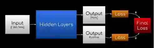 此图仅有两个维度以用于可视化目的。 如果这个比喻让你无法理解,请查看对梯度下降的理解:https://bit.ly/2C080IK。现在,如果你希望神经网络执行多个任务怎么办? 例如,预测句子中的下一个单词并进行情感分析(预测态度分为正面,中立或负面。例如,“你很棒”被归为正面)。