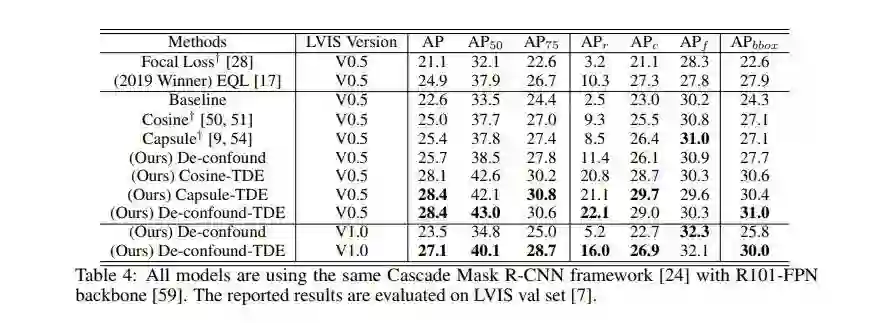 同时我们直接运用到LVIS长尾实例分割数据集下后,我们也超过了去年LVIS 2019比赛的冠军EQL(当然是在相同setting下,比赛正式结果还包含很多比赛专用的trick,比如额外数据,模型融合等)。关于LVIS的实验,比较逗的是,我们paper投出去后,LVIS官方更新了数据集,因此我们最终版也在最新的LVIS V1.0下跑了个结果,方便大家比较。