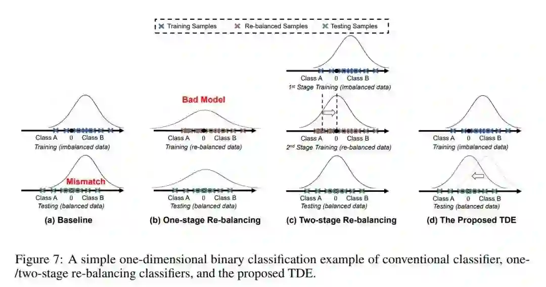 其中高斯曲线代表预测的分布,可以看到传统的直接训练和单步的re-balancing都有严重的问题,而2-stage的方法通过第二步再训练去矫正分类器的分类边界。我们提出的TDE方法则直接通过矫正特征本身的分布来更简单优雅的解决了分布不均衡的问题。