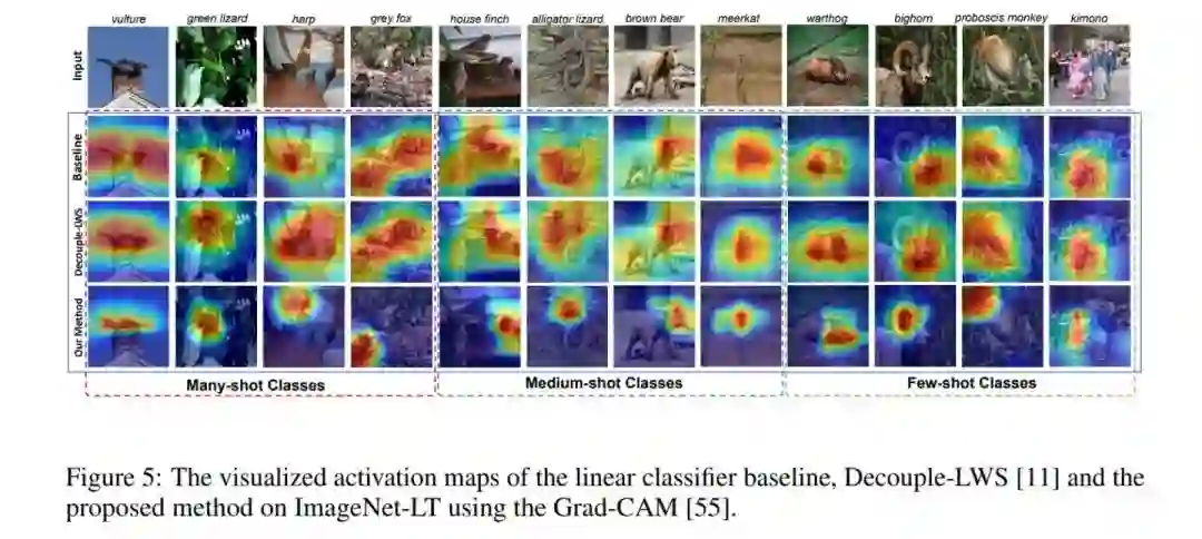 下面是最有意思的,当我们用Grad-CAM可视化了我们的feature map后我们发现,De-confound-TDE事实上让feature map更紧致了,即更关注少数区分度高的区域,而非整体结构。比如下图中“长牙野猪”的例子,传统的算法关注整个身体,而这部分其实和“猪”这个大类没什么区别,唯一的区别在于“长牙”,而我们的算法则明显的关注到了这些区分度高的紧致区域中了。