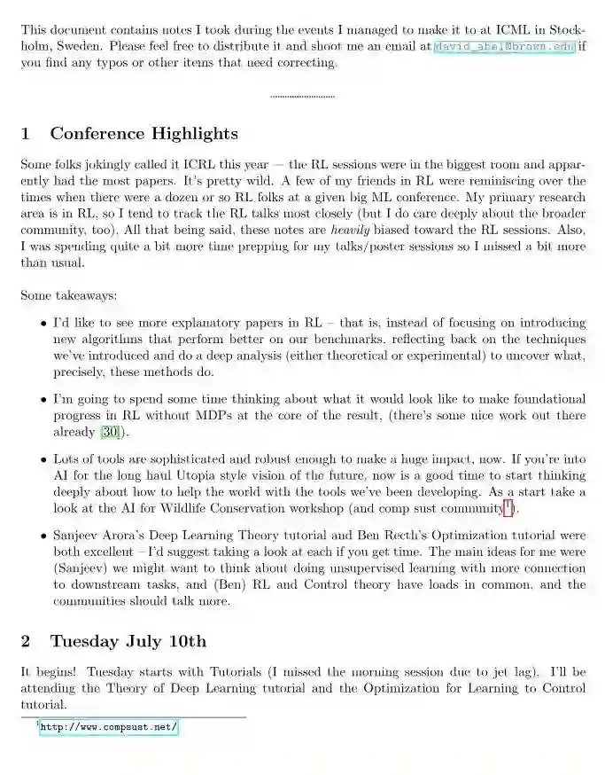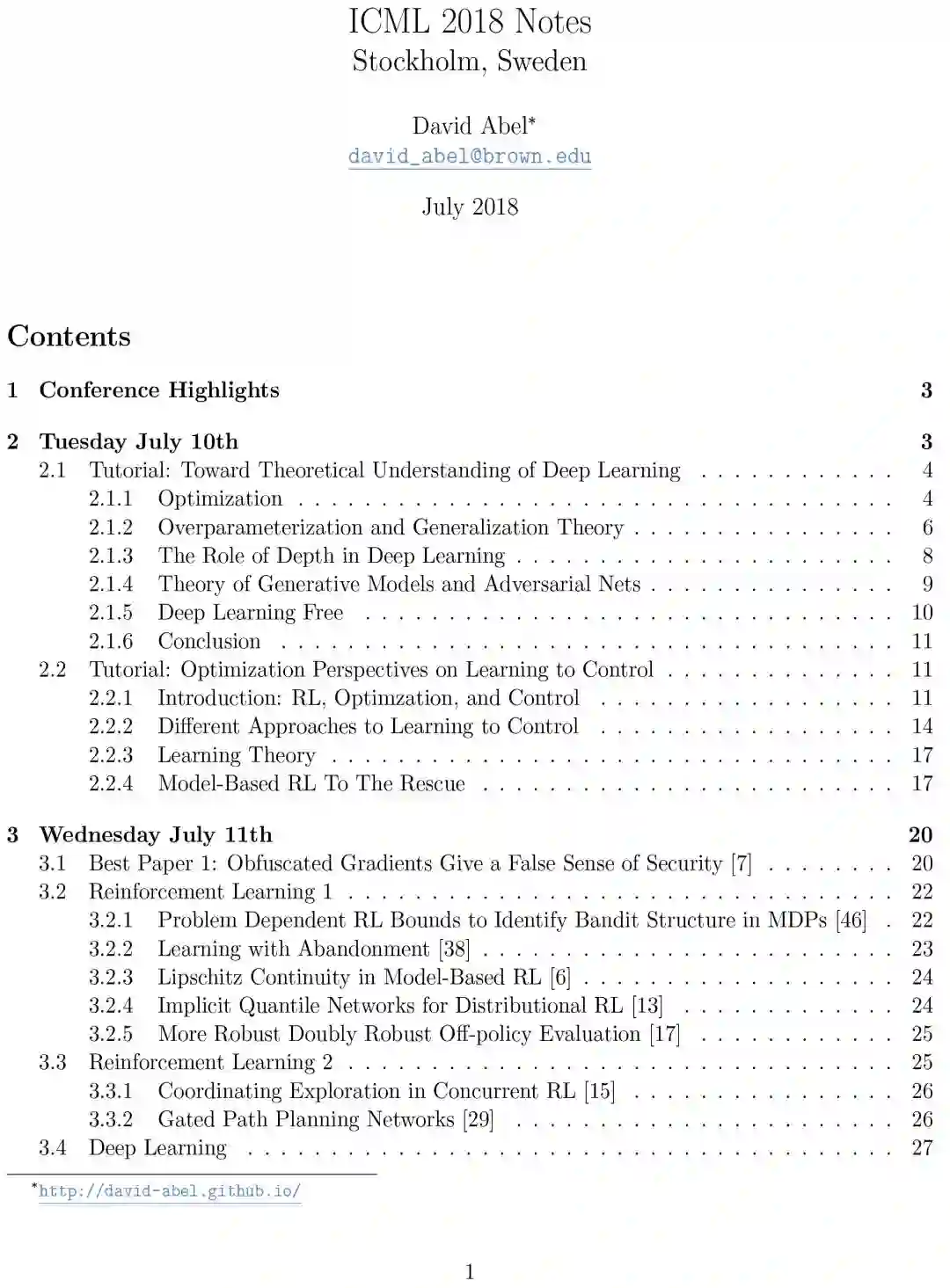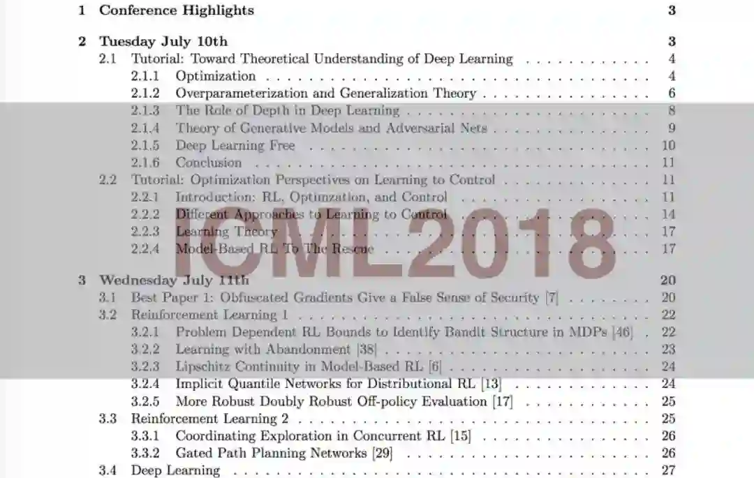 ICML2018结束的第二天,一位来自美国布朗大学的学霸就公开分享了他在这次大会上整理的长达50多页的珍贵笔记。这份笔记不仅内容详实,包含了不少来自现场拍摄的PPT图片,还根据参会日期和会场做了详细的目录,不可多得。