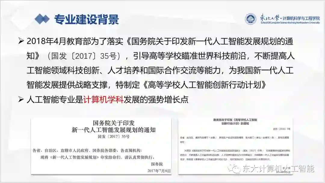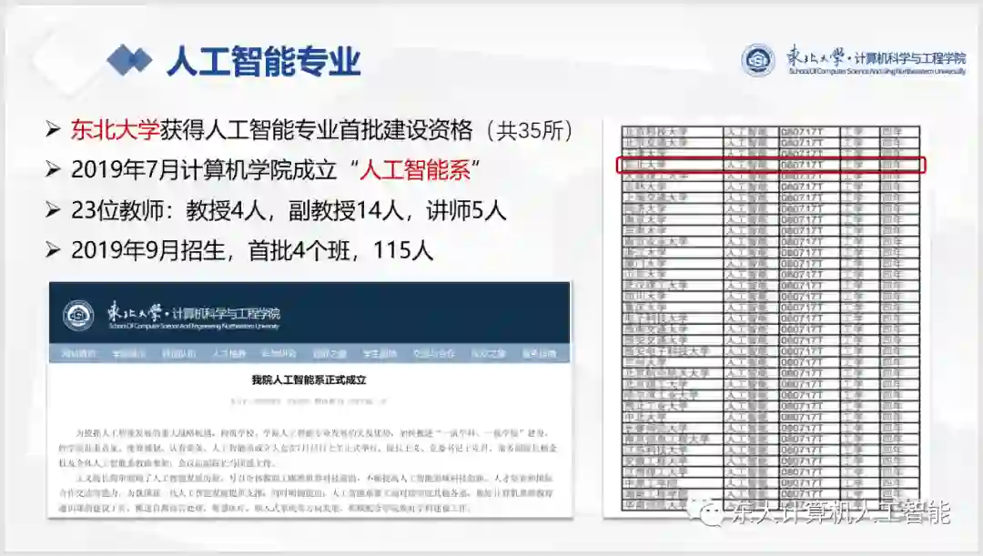 东北大学计算机科学与工程学院为加快推进“一流学科、一流学院”建设,紧跟国家新一代人工智能发展战略需求,于2018年组织申报人工智能专业,于2019年3月获人工智能专业首批建设资格,全国共有35所高校获批。