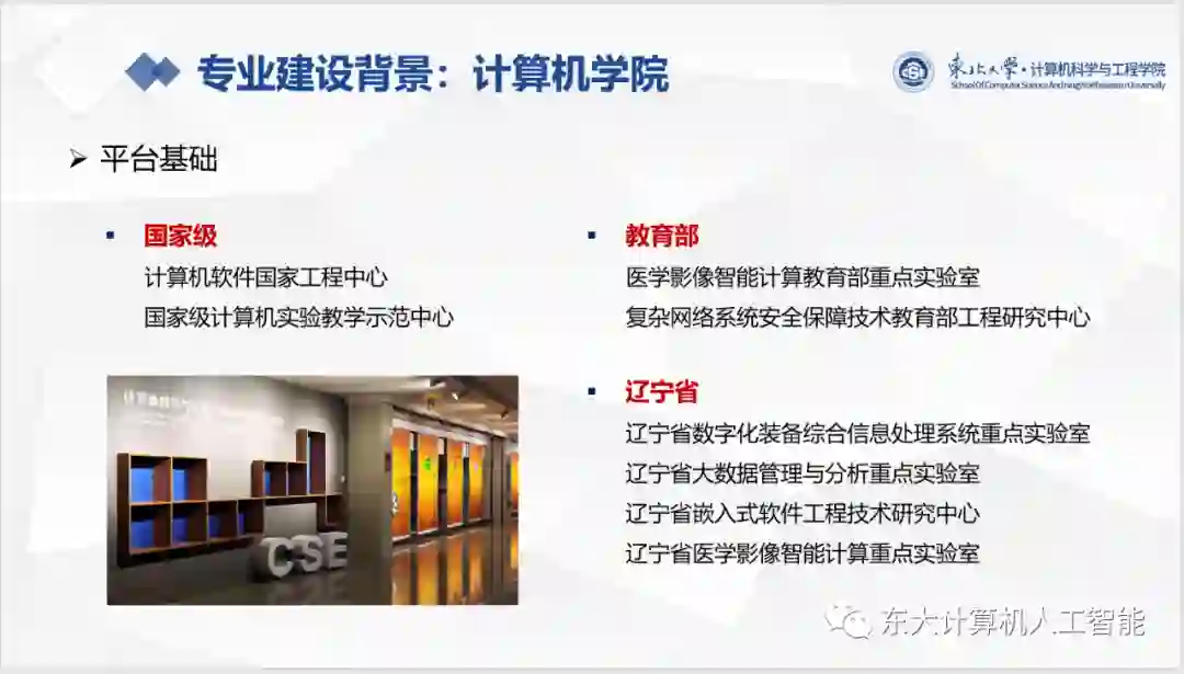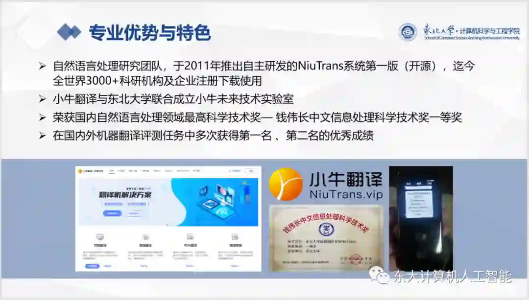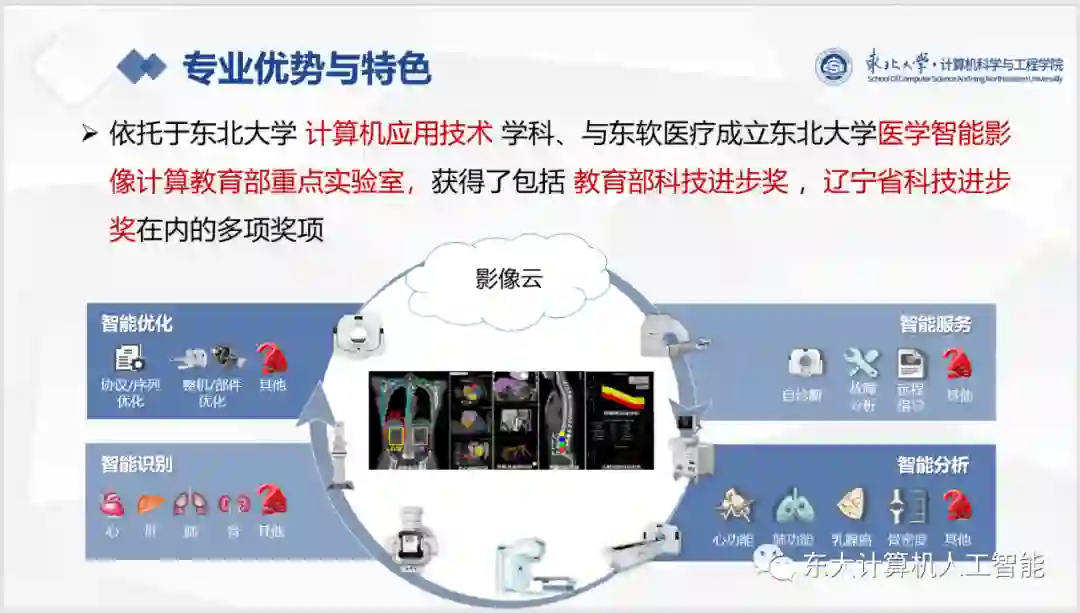 医学智能影像计算教育部重点实验室和自主研发的NiuTrans系统作为人工智能专业的优势与特色,为专业建设奠定了强有力的基础。依托于东北大学计算机应用技术学科、与东软医疗成立东北大学医学智能影像计算教育部重点实验室,获得了包括教育部科技进步奖、辽宁省科技进步奖在内的多项奖项。