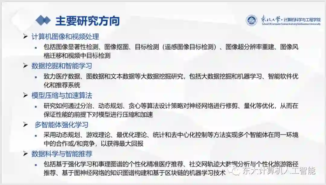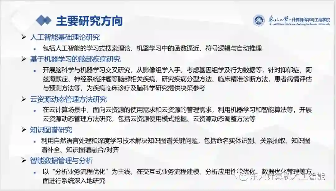 人工智能专业同时针对人工智能基础理论、基于机器学习的脑部疾病研究、云资源动态管理、知识图谱研究、智能数据管理与分析、计算机图像和视频处理、数据挖掘和智能学习、模型压缩与加速算法、多智能体强化学习和数据科学与智能推荐等多个方向进行深入研究。