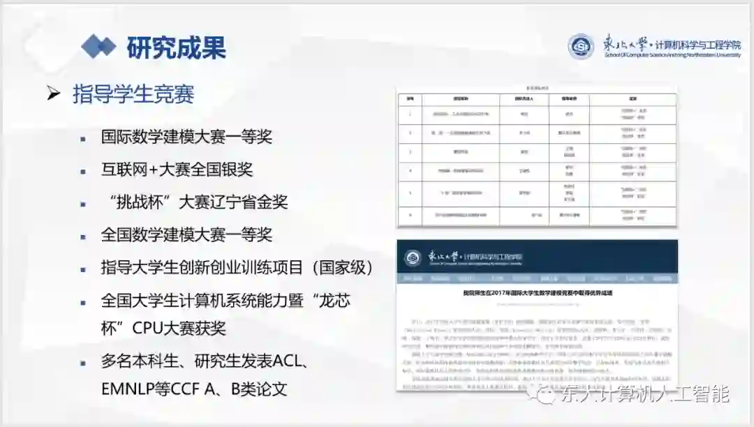 在人工智能领域的全国知识图谱与语义计算大会CCKS评测、机器翻译WMT评测和CCMT评测、顶级会议MICCAI左心室分割比赛、国际数学建模大赛和互联网+大赛等评测与竞赛中取得了优异的成绩。同时,指导多名本科生、研究生发表ACL、EMNLP等CCF A、B类论文。