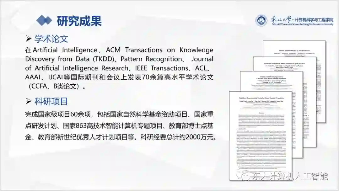 通过人工智能专业师生前期的不断努力与积累,我们在学术论文、科研项目、应用系统、开源和评测与竞赛等方面取得了丰富的研究成果。在Artificial Intelligence、ACM Transactions on Knowledge Discovery from Data (TKDD)、Pattern Recognition、 Journal of Artificial Intelligence Research、IEEE Transactions、ACL、AAAI、IJCAI等国际期刊和会议上发表70余篇高水平学术论文(CCFA、B类论文)。完成国家级项目60余项,包括国家自然科学基金资助项目、国家重点研发计划、国家863高技术智能计算机专题项目、教育部博士点基金、教育部新世纪优秀人才计划项目等。