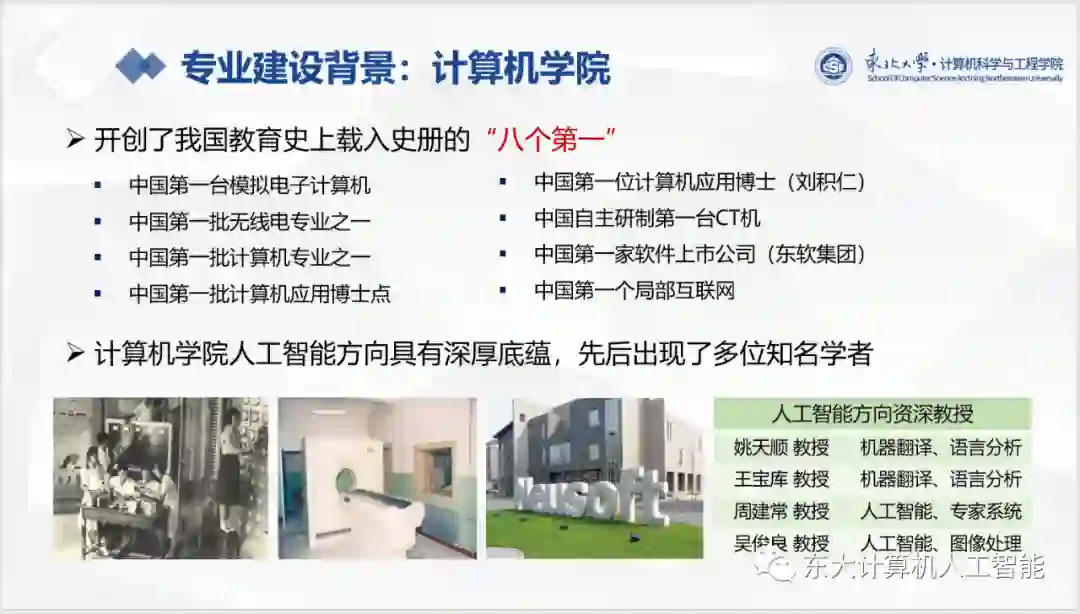 计算机科学与工程学院具有辉煌的历史,开创了我国教育史上载入史册的“八个第一”, 成功研制了我国第一台模拟电子计算机、自主研制了我国第一台CT机和孕育了国内第一家软件上市公司(东软集团)等。学院在人工智能方向具有深厚底蕴,先后出现了多位知名学者。