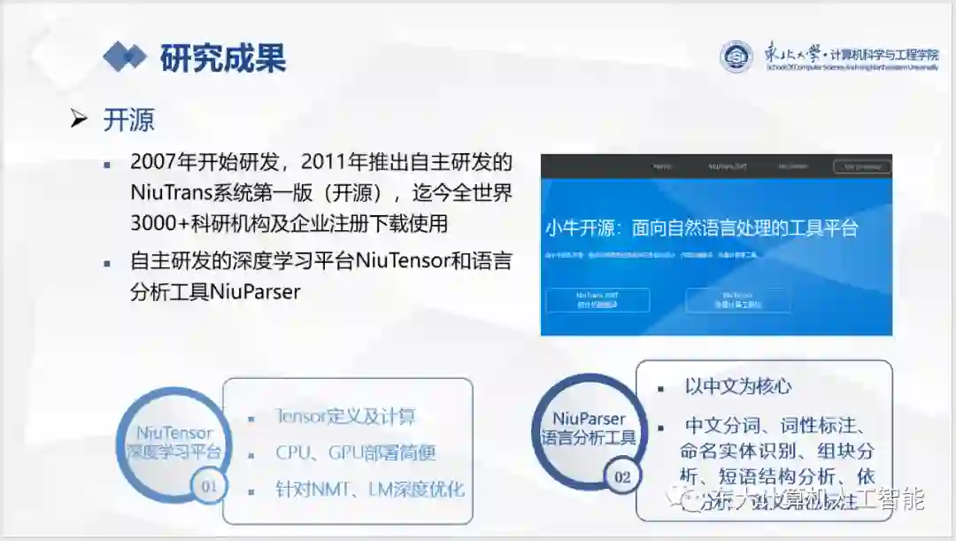 自然语言处理研究团队,于2011年推出自主研发的NiuTrans系统第一版(开源),迄今全世界3000+科研机构及企业注册下载使用,并在国际和国内机器翻译比赛和评测中多次获得冠军。