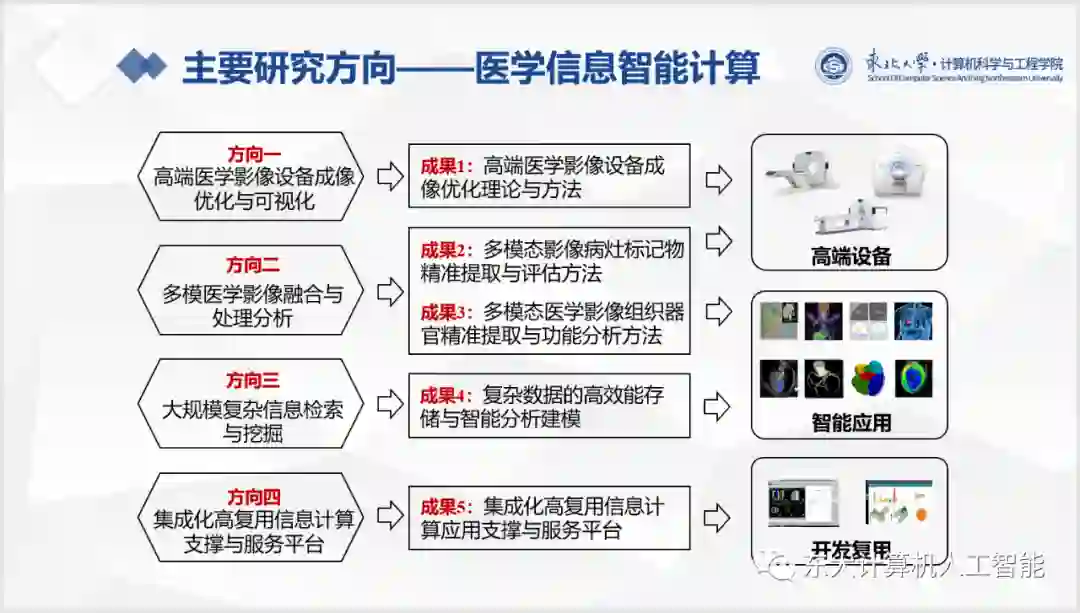 围绕人工智能专业建设目标和专业特色,开展医学信息智能计算、自然语言处理等研究方向。医学影像智能计算教育部重点实验室以面向高端设备和精准医疗等国家重大战略需求,建立开放、创新和协同的运行机制为总体目标,聚焦四个研究方向,方向一高端医学影像设备智能成像理论与方法,重点开展理论与方法探索;方向二多模医学影像智能处理方法和方向三多源医学数据智能分析方法,重点实现关键技术突破与创新;方向四集成化高复用医学信息计算支撑与服务平台,重点支撑成果转化与应用。