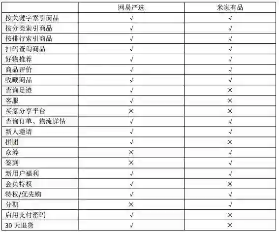 基本的搜索商品、收藏商品、加购物车、购买商品、评价以及平台的好物推荐,两者都具备,网易严选有的一些优势功能包括查询足迹,会员特权、拼团包括平台客服等功能,米家有品也有包括众筹,签到,和分期等功能是严选不具备的。