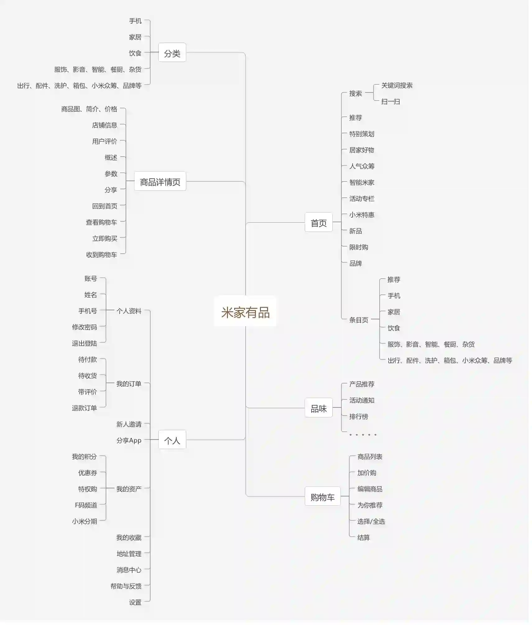 这两家的总体架构基本无区别,也和国内绝大多数的电商品牌没有什么差异,首页中共有的部分有推荐、限时购、品牌(小米中叫品牌,严选中叫品牌制造商直供)、新品、以及各类产品分类。