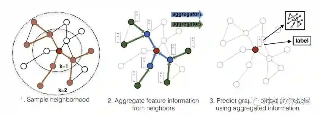 GraphSAGE 的运行流程如上图所示,可以分为三个步骤: