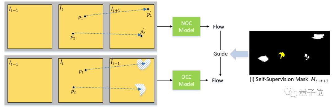 然后,研究人员用人为制造遮挡的方法造出新的被遮挡像素数据,利用之前已经学习到的没有被遮挡像素的光流作为监督数据,去指导神经网络学习被遮挡像素的光流。
