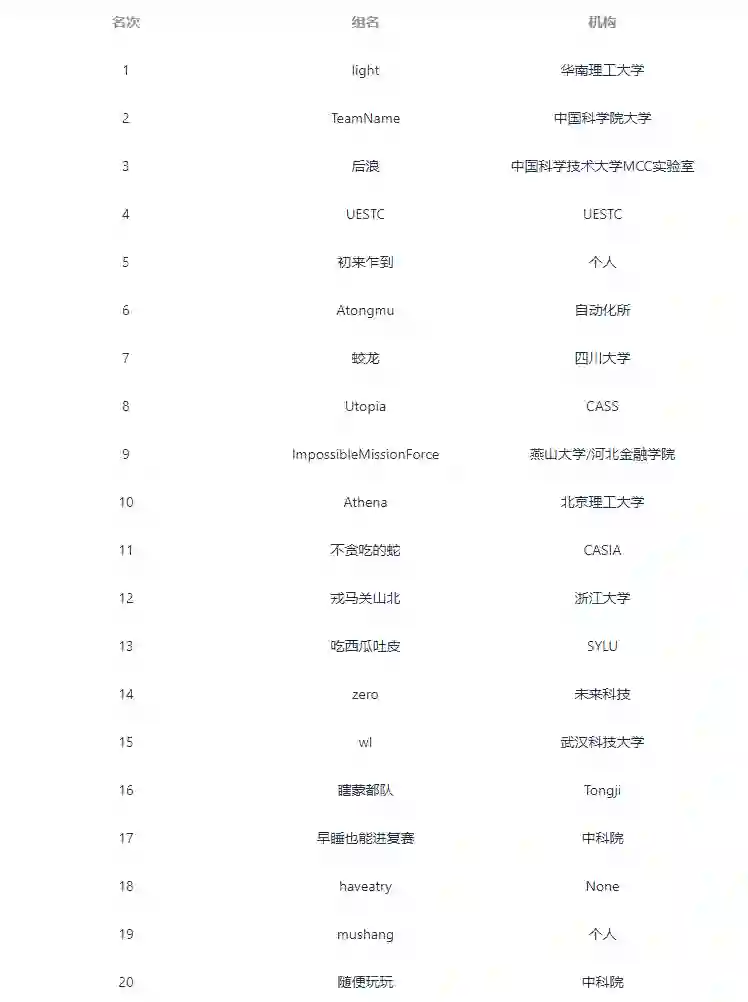 RLChina 智能体挑战赛 - 辛丑年秋赛季“贪吃蛇 3v3”比赛已于2021年10月23日圆满结束。本次比赛共有66支队伍参赛,获得前三名的队伍分别来自华南理工大学、中国科学院大学、中国科学技术大学。20强队伍如下: