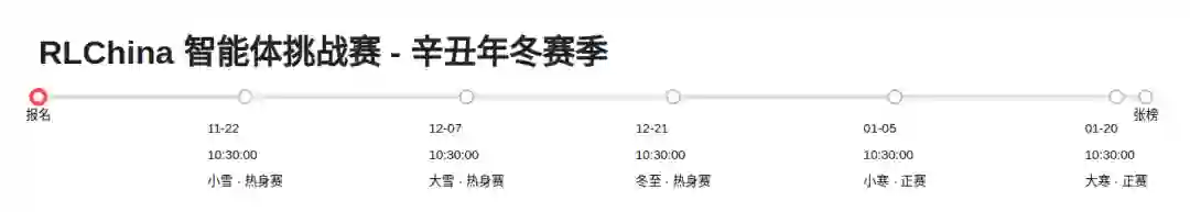RLChina 智能体挑战赛 - 辛丑年冬赛季于 2021 年 11 月 8 日至 2022 年 1 月 20 日在中科院自动化所“及第”平台举行,赛程包括三次热身赛和两次正赛,五场比赛的日期分别是中国农历节气小雪、大雪、冬至、小寒、大寒。