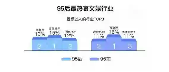 早在2016年,腾讯曾发布一则《QQ大数据微报告:95后抖屏择业观大起底》,报告指出,95后追求个人兴趣,在择业上更加“自我”,但更看重较高的物质回报,也较少拼搏奋斗的精神。因此,在就业上,他们更乐意选择文体娱乐,互联网则居于次席。与此同时,近两年大学生的创业意愿越来越低。这两种现象多多少少有些关联。