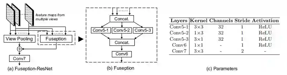 如上图所示,受ResNet启发,我们提出Fuseption-ResNet架构,其中视图池化作为短路连接,并加上Fuseption分支负责学习残差映射。两个分支在精度和收敛率方面互相加强。采用3×3、1×3和3×1三种不同尺寸的的轻量级空间滤波器提取不同类型的特征。随后,采用上述级联特征映射的1×1卷积负责跨通道的统计量的合并以及降维。最后利用置信传播来进行匹配