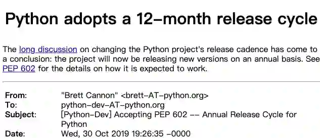 PEP 602 的作者是 Python 3.8 和 3.9 的发布经理 Łukasz Langa,Python 3.8 已经释出,新的发布周期将从 Python 3.9 开始采用。