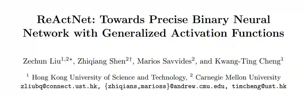 ECCV 2020 将于8月23日开始,作为两年一度的计算机视觉三大会议之一,备受大家关注。今天和大家分享一篇由香港科技大学和卡耐基梅隆大学共同发表在 ECCV 2020 上的工作《ReActNet: Towards Precise Binary Neural Network with Generalized Activation Functions》,是 Bi-Real Net 作者在二值化研究领域的最新成果。