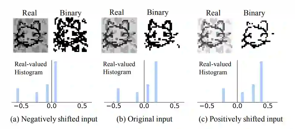 而达成这个高精度的网络ReActNet的核心,其实是非常简单直接操作。作者通过实验发现,BNN卷积输出的特征图很难同时兼顾携带足够的特征信息和保证输出值范围适合下一层二值化操作。即,如果直接对网络中传递的实数值进行取Sign操作,可能会遇到由于实数值范围不合适而导致的二值化特征图携带信息量低。如下图所示。