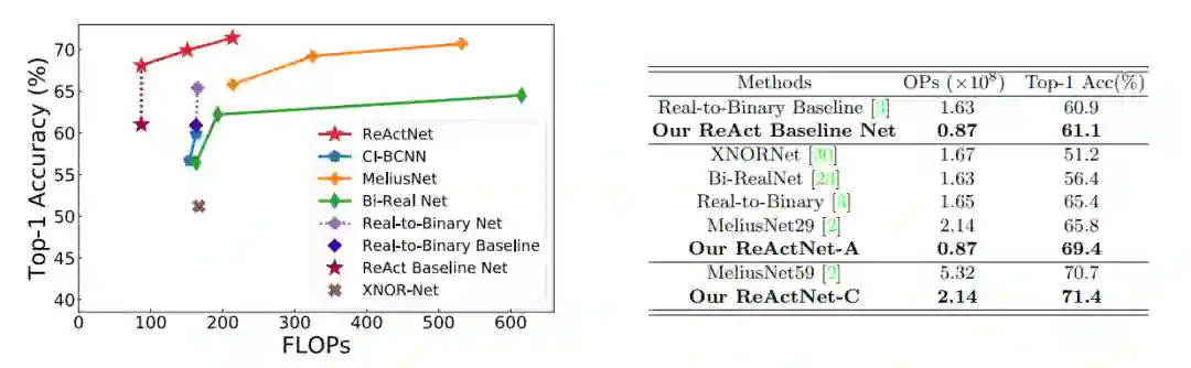 结合Distributional Loss 和基于MobileNetV1的网络改进,采用了RSign 和RPReLU 的ReActNet 能在ImageNet数据集上取得了69.3% 的 Top-1 Accuracy,超过了SOTA的结果。