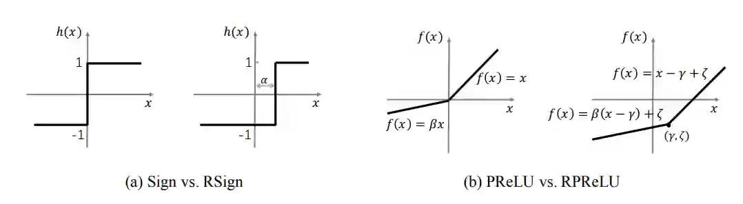基于这个观察,作者提出了Generalized Sign 和 PReLU 函数,称之为RSign (ReAct Sign)和 RPReLU (ReAct PReLU),通过一个可学习的位移量来让网络自动学习最适合的binary阈值和Activation的分布。