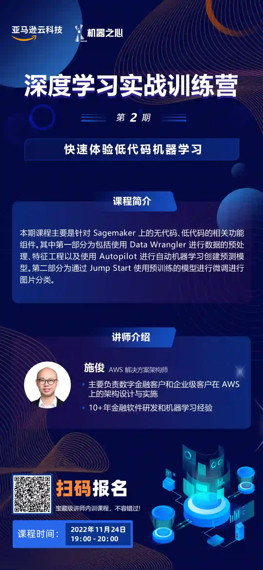 为了帮助开发者快速提升实战能力,机器之心联合亚马逊云科技开设了《深度学习实战训练营》线上实战营。实战营为期3周,共6次课程,还有6次课后作业,实战营期间讲师将在答疑群中随时解决同学的疑问,全程免费,欢迎希望上手实操深度学习的同学加入学习。