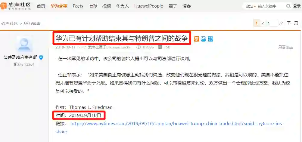 9月11日,华为的心声社区披露, 在一次罕见的采访中,任正非首次提出与美司法部谈判:计划帮助结束与特朗普的战争。
