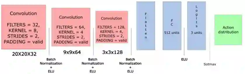 与射击场景的模型的差异在于,输出为该状态下执行 action 的概率分布,如下所示: