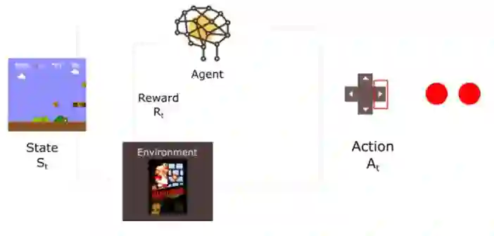 上图中环境(env)为超级玛丽昂这个经典游戏(Super Mario);智能体(agent)可以认为是一个 AI 机器人,在不断尝试玩这个游戏,实现智能体的自我进化;状态(State)为智能体(Super Mario Bros)在特定时间点的游戏界面中的位置信息,可以认为是一张游戏界面的截图;行动(action)为智能体根据当前的状态信息,所采取的动作,比如上、下、左、右、跳,相当于智能体和环境在进行交互操作;当智能体执行完动作后,智能体会从当前状态转移到下个状态,即游戏的下一帧;奖励(reward)为智能体执行完动作后获得的分数,比如执行完向前动作后,如果智能体不死,则得分加 1。强化学习的基本思想为智能体能够最大化期望的累积奖励,用数学公式可表示为: