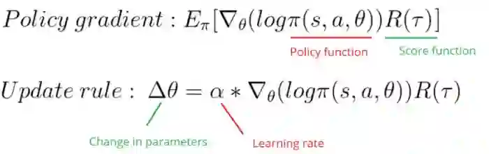 策略梯度算法的主要思想为通过优化θ,改变策略的概率分布,从而使得智能体能取得高的期望奖励,优化方式如下所示: